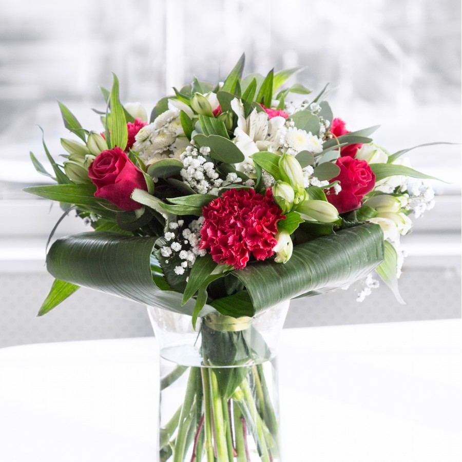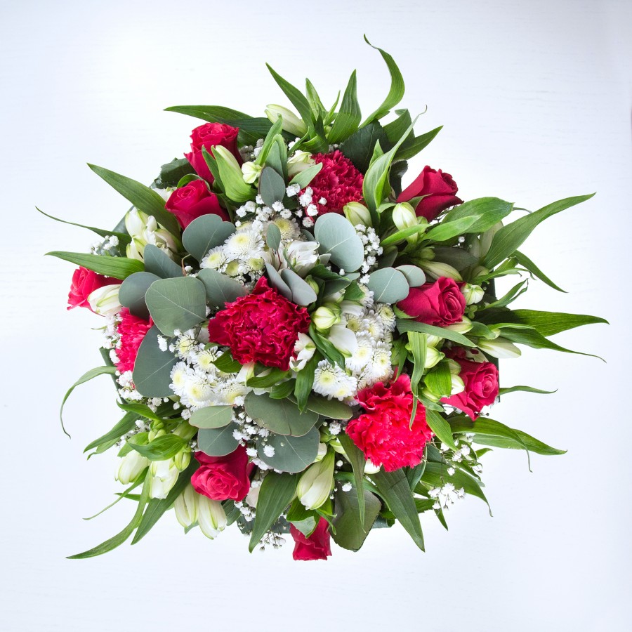 Discover the unique beauty of our vibrant flower arrangement. This bouquet features sweet white chrysanthemums, delicate gypsophila, stunning red roses, lively carnations, elegant white alstroemeria, and lush aspidistra leaves, all thoughtfully combined.