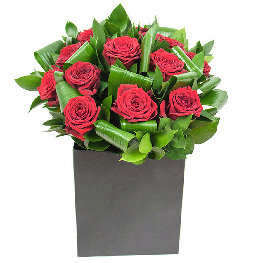 Revel in the beauty of our radiant bouquet, where each red rose is paired with the natural elegance of aspidistra leaves and ruscus. Designed for those who appreciate the finer details, this floral masterpiece merges bold color with exquisite design, offering a truly luxurious gift option. The blend of passionate red and vibrant green creates an unforgettable visual appeal.